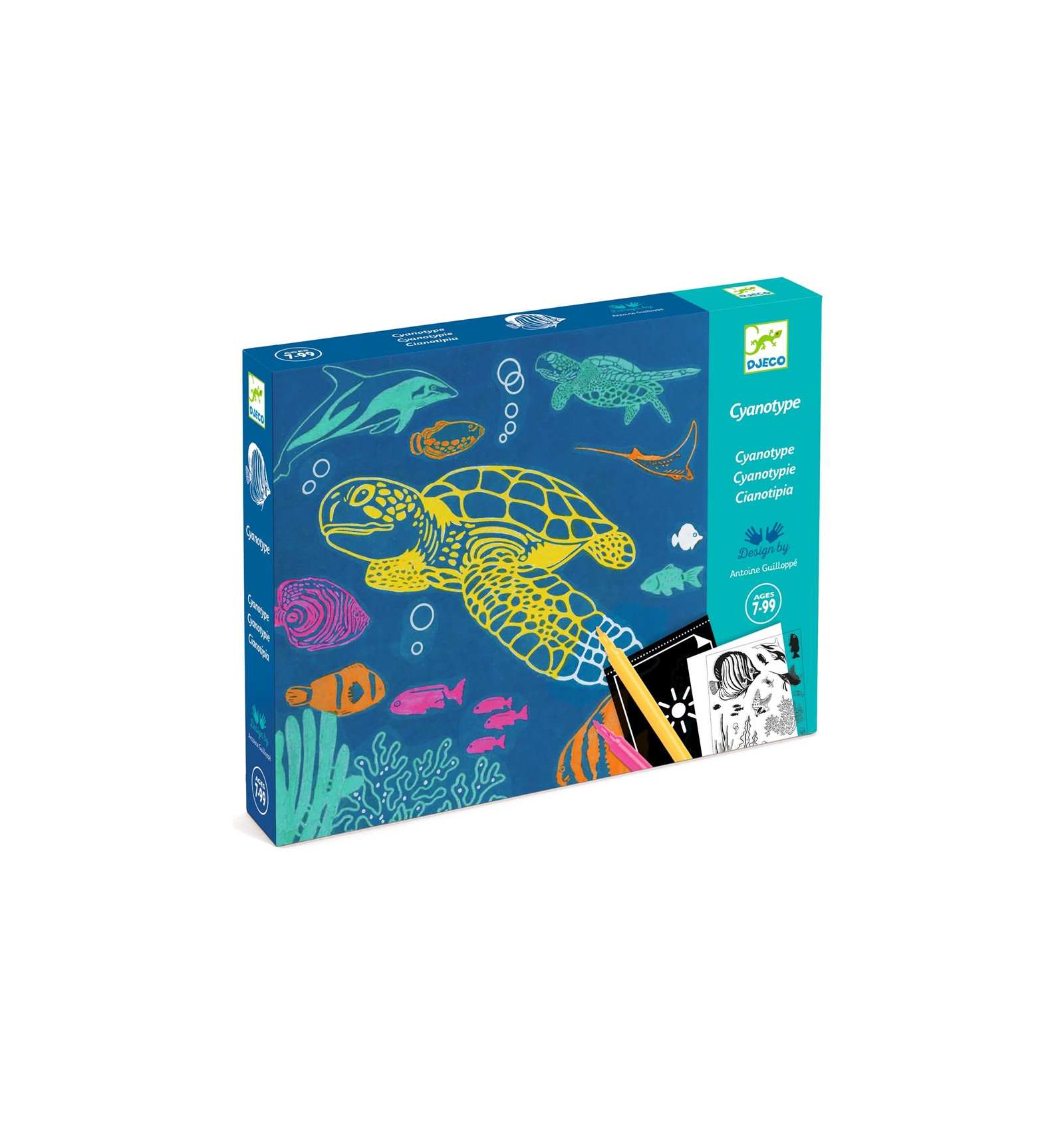 Cyjanotopia to technika utrwalania obrazu z początków fotografii wykorzystująca światłoczułość specjalnego papieru. Zatrzymaj chwilę i pozwól, by światło stworzyło obraz. Zestaw artystyczny cyjanotypia OCEAN marki Djeco to niezwykłe zaproszenie do kreatywnej podróży inspirowanej podwodnym światem, w której nauka spotyka się ze sztuką, a eksperyment zamienia się w prawdziwą magię.