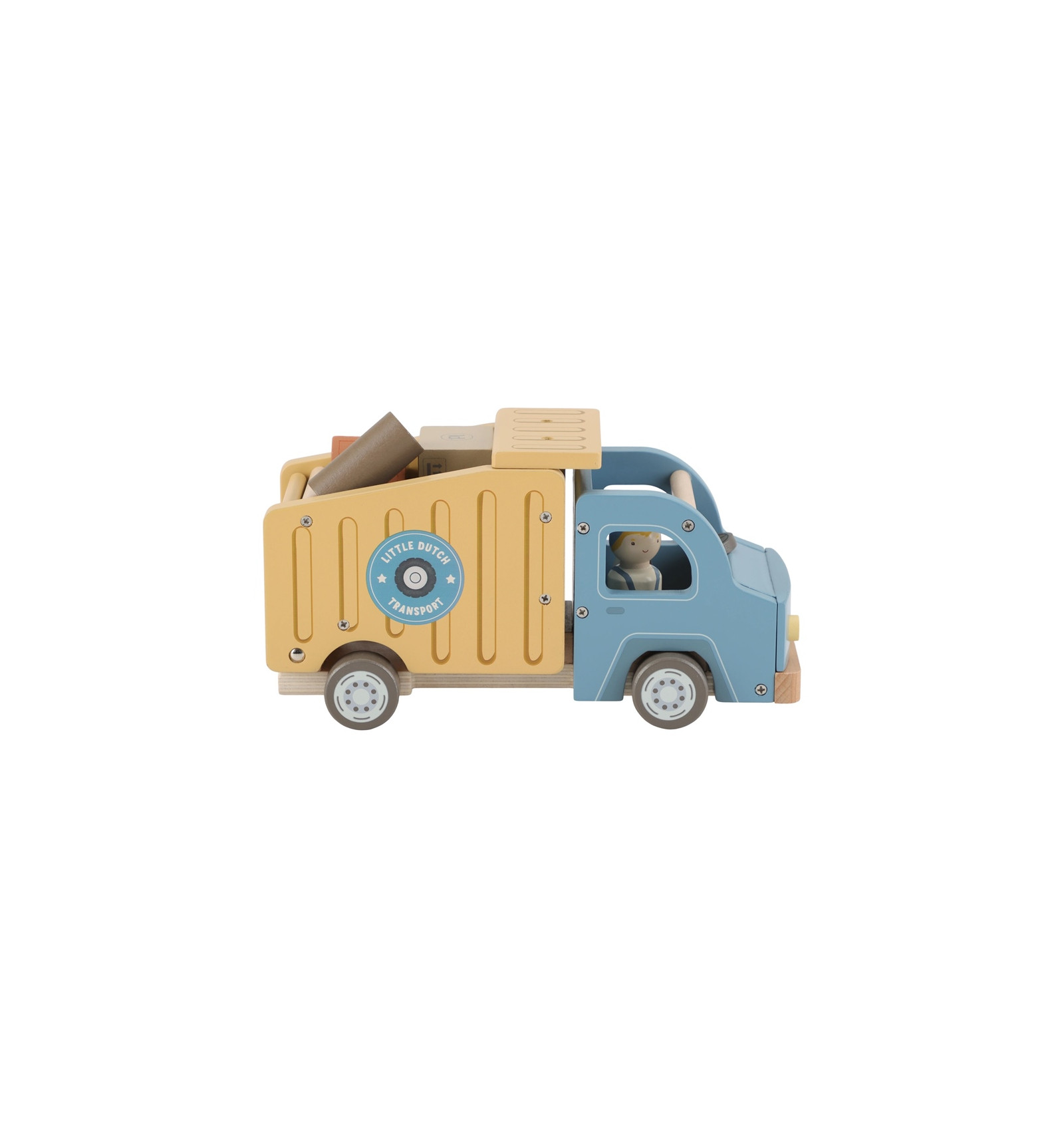 Drewniana wywrotka z kierowcą i elementami do przewożenia - skrzynie,