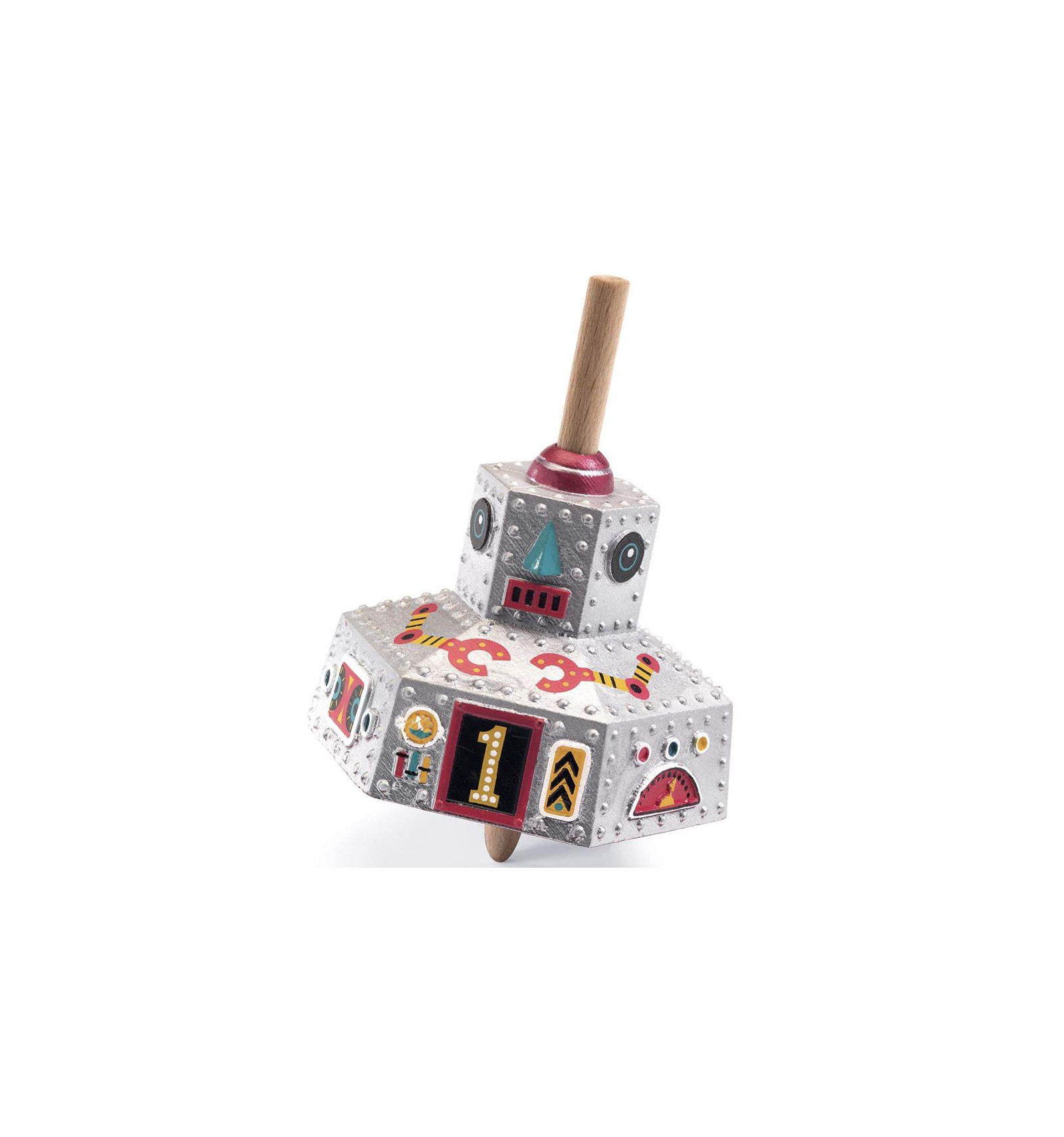 Drewniany bączek - srebrny robot