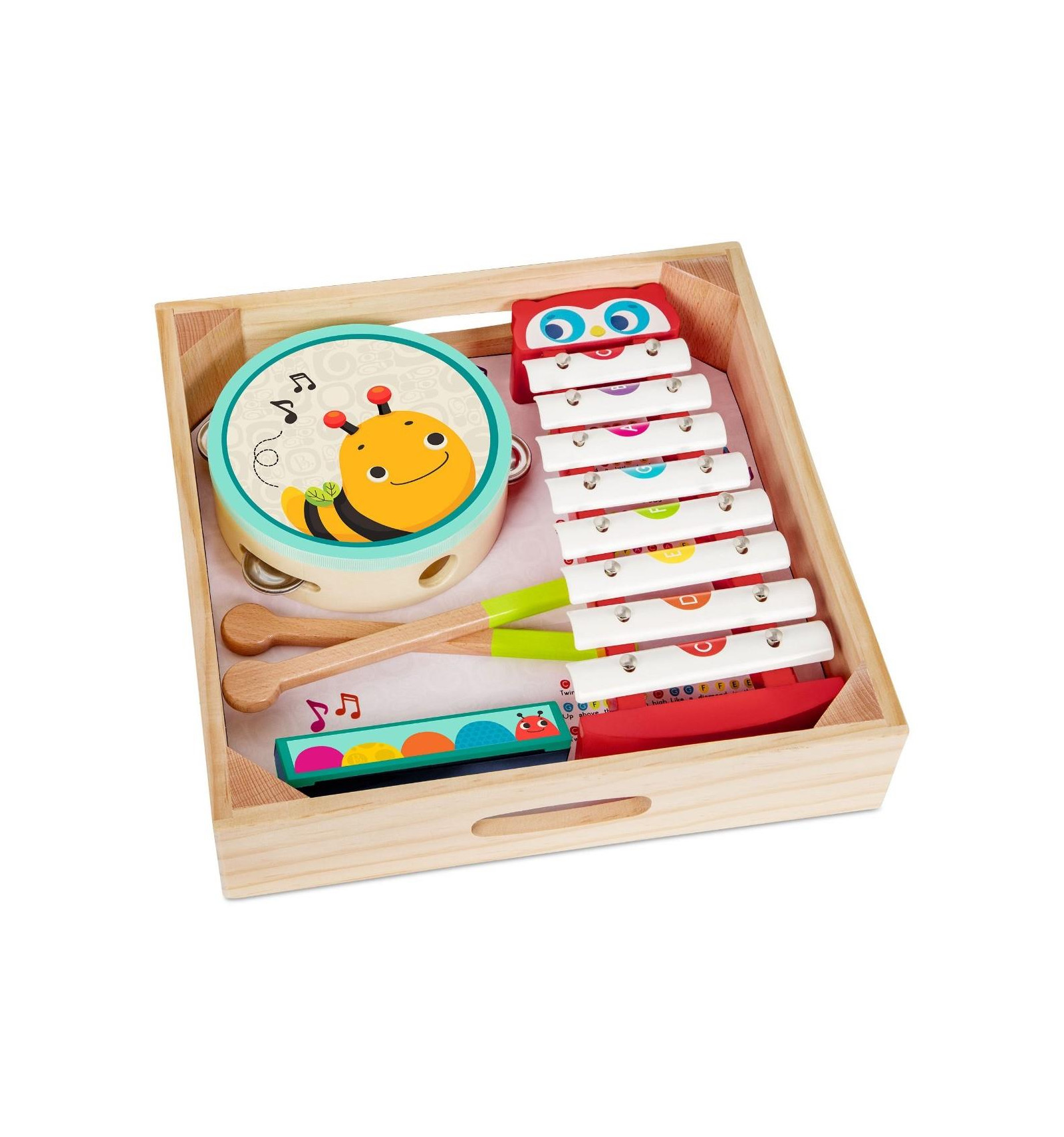 Zestaw zawiera: cymbałki z pałeczkami, bębenek - tamburyn oraz