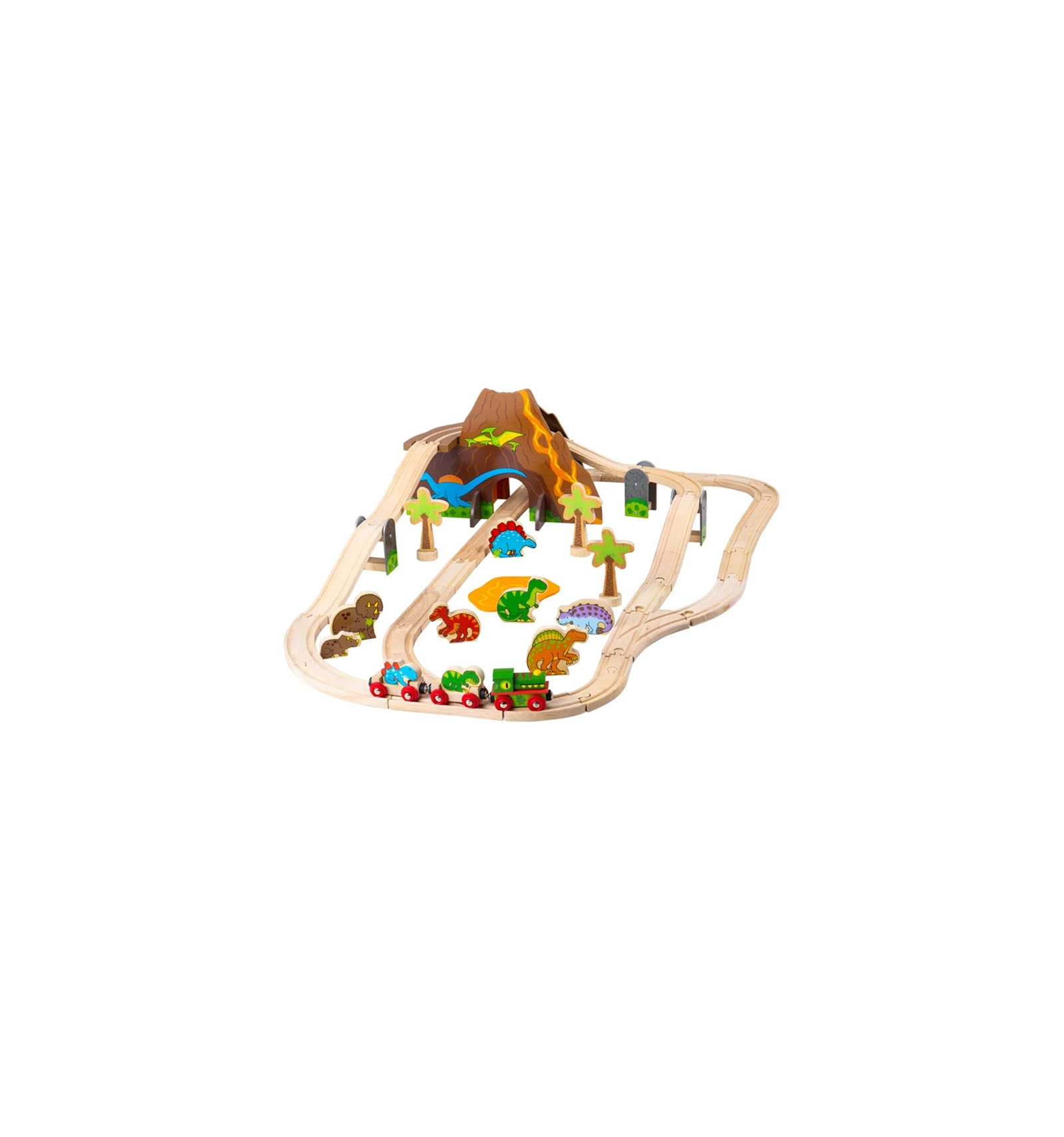 Dinozaurydużydrewniany zestaw z torami i pociagiem i wulkanem