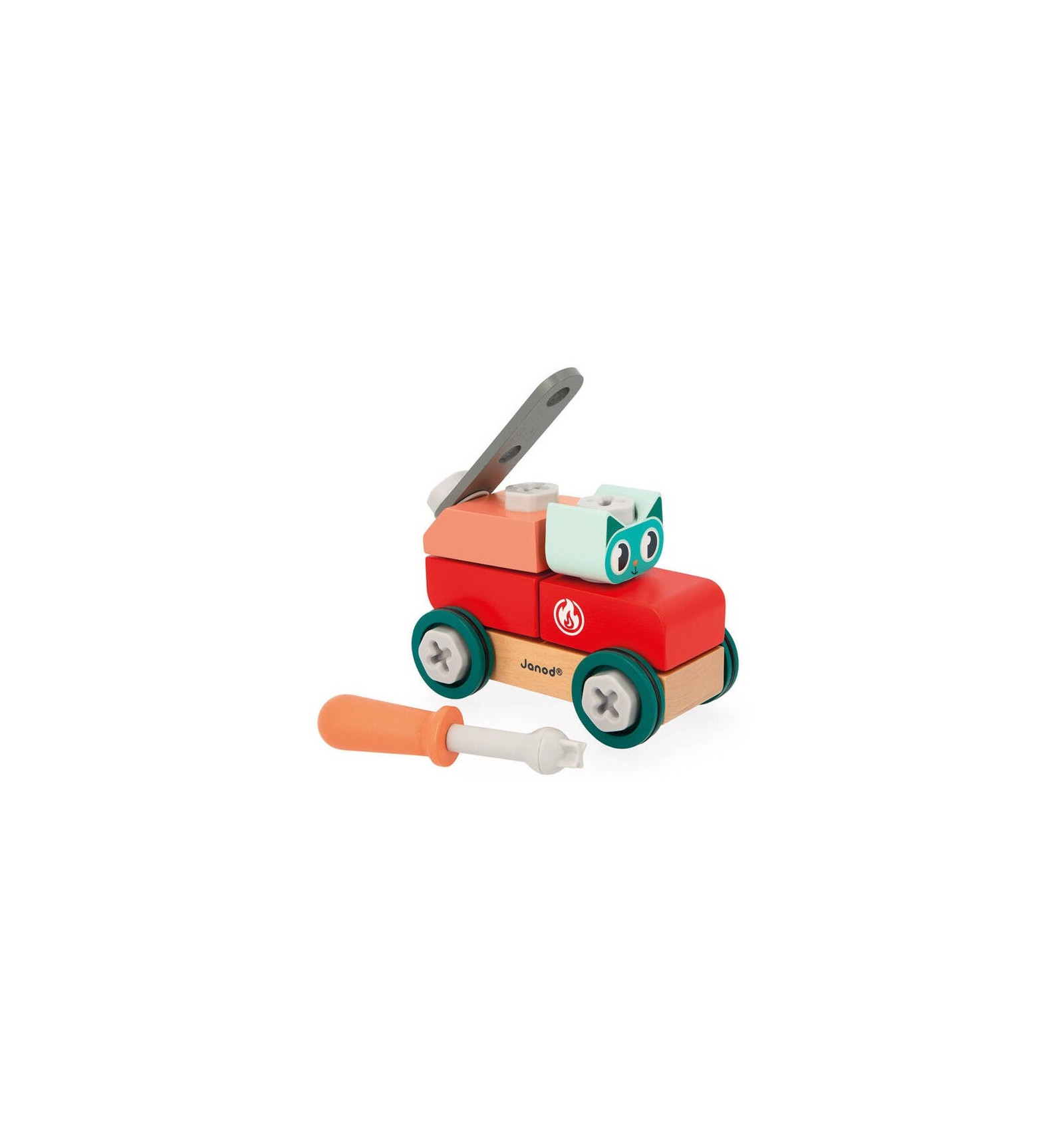 W zestawie czeka drewniane auto do samodzielnego złożenia oraz uroczy kot-kierowca, który tylko czeka, by ruszyć w trasę. Dziecko może po kolei przykręcać elementy, dopasowywać części i obserwować, jak z małych kawałków powstaje prawdziwy samochód.