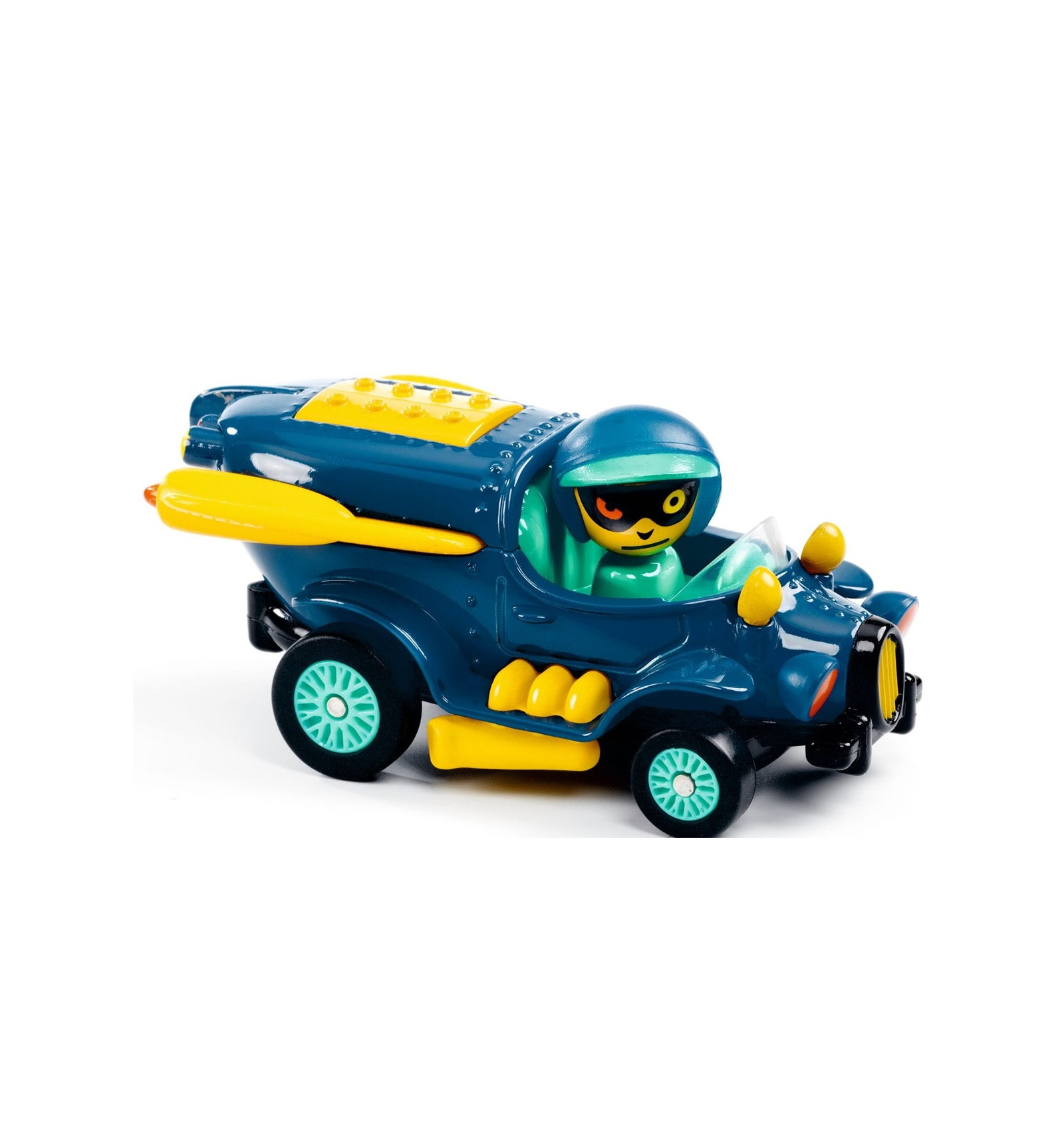 Szalone autko wyścigowe Navy Flying z serii Crazy Motors marki Djeco. Samochodzik Navy Flying wykonany jest z najwyższą dbałością o szczegóły i posiada wyjątkową szatę graficzną. Pojazd jest wykonany z metalu i pojedynczych plastikowych części, posiada także metalowe zawieszenie i gumowe opony. W każdym samochodziku za kierownica siedzi inny kierowca, z obracaną głową (sama postać jest przymocowana na stałe). Navy Flying wyróżnia się unikalnym wyglądem – posiada żółte owiewki, co nadaje mu charakterystyczny, morski akcent. Motyw ten nawiązuje do tematyki nurkowania i odkrywania tajemnic głębin oceanu lub latania. Dodatkowo, supersilne światła i silnik sprawiają, że autko jest gotowe na każdą przygodę podwodną.