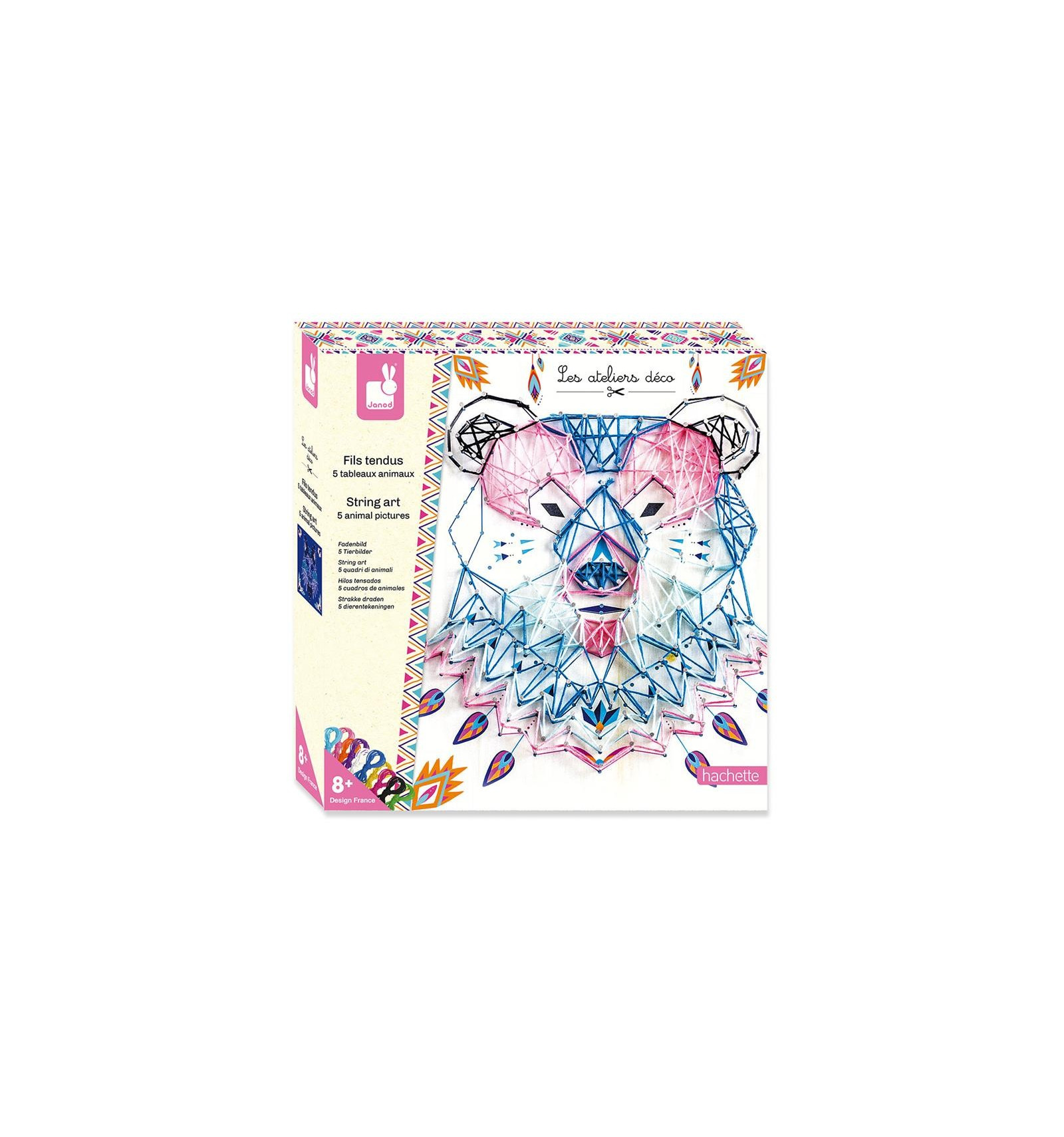 Zestaw kreatywny Janod String Art Zwierzęta – przestrzenna przeplatanka 3D z muliną i gwoździkami dla dzieci 10+. Kreatywna zabawa dla dzieci 10+, rozwijająca wyobraźnię, motorykę i cierpliwość.Idealna zabawa artystyczna i prezent dla młodych twórców.