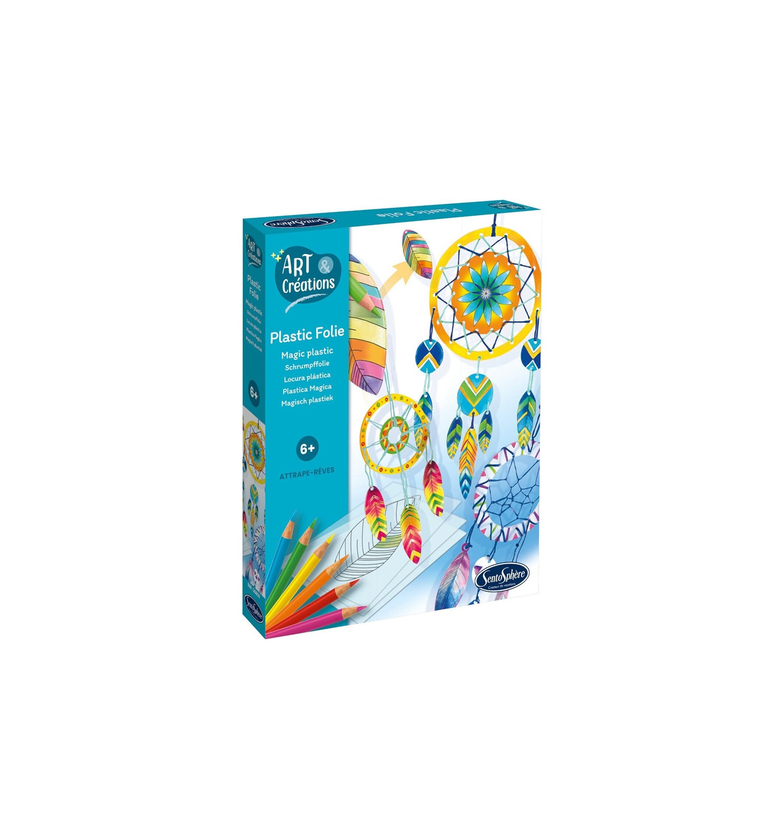 SentoSphere „Magiczny plastik” to kreatywna zabawa, która pozwala dzieciom zamienić własne rysunki w dekoracje - łapacze snów. Specjalny arkusz termokurczliwego plastiku umożliwia stworzenie mini dzieł sztuki w 4 prostych krokach: pokoloruj, wytnij, włóż do piekarnika i gotowe – plastik skurczy się i stwardnieje, zachowując kolory i kształty.